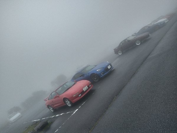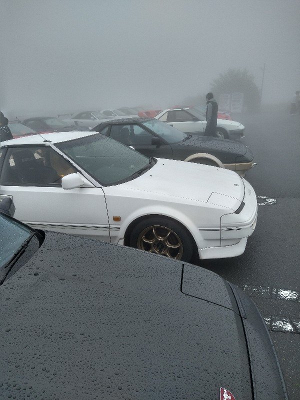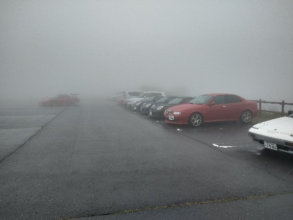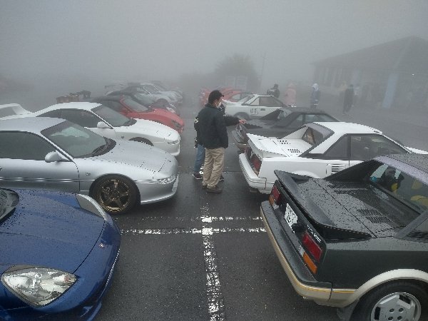 雨が止んだようなので外で参加車両の撮影を試みたのですが濃い霧で近くの車両しかハッキリと映りません。