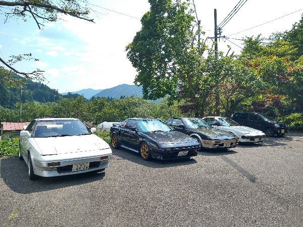 ここで待ち合わせをしていた仲間も11時過ぎに到着…でも車がMR2じゃないのは、出かけようとエンジンを始動したらコーションランプが点灯して、エンジン用のファン(車体右、運転席側ドア後ろにあるエアインテーク用のファン)異常だったので暑い季節ということもあり他の車にした…という話でした。